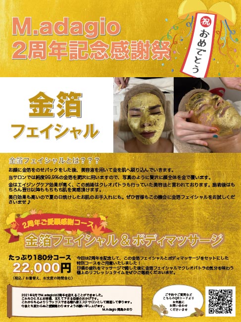 銀座の隠れ家エステ M adagio 2周年記念感謝祭【金箔フェイシャル】